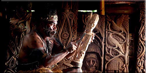 The Asmat homeland comprises the rugged and isolated southern coast of Irian Jaya. It is an area of approximately 10,000 square miles and comprises mainly swamps and mangroves. Ancestor figures were traditionally made only for the festival honoring Fumer-ipits. They wear a unique costume. Tourists demand, however, is as resulted to change to this custom. Previously, after the festival, the figure is discarded into the forests near a sago tree because it was believed that as the wood of the carving is deteriorated, the power of the ancestor was transferred to the sago palm. Other ancestor carvings are designed as elements in larger carvings, such as canoe prows, paddles or ancestor poles